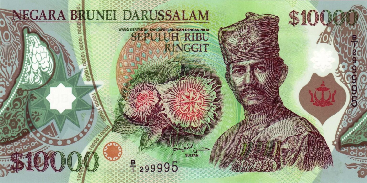 A világ legnagyobb értékű bankjegye bruneiben használatos, az elszigetelt ázsiai ország uralkodója nem mellesleg az egyik leggazdagabb élő ember. 10 000 brunei dollár a címlet, a jelen árfolyamon 7 584 amerikai dollárt ér.