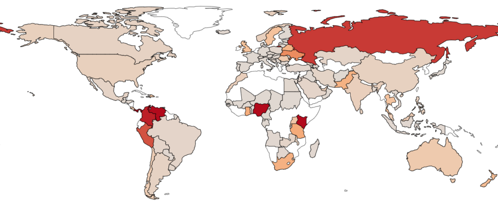 Ugyancsak fontos különbség a tőzsdékhez képest, hogy míg azokon a forgalom nagy része az altok és a BTC között zajlik, a LocalBitcoins tranzakcióinak gyakorlatilag 100%-át helyi valuta/BTC alapon bonyolítják, tehát az itt mért forgalom mértéke sokkal hitelesebb képet adhat a Bitcoin iránti valós, lokális igényekről. A lenti képen például jól látható, hogy míg a 2017-es buborék kipukkanása után a legtöbb helyen alábbhagyott az érdeklődés a Bitcoin iránt, addig Dél- és Közép-Amerikában, valamin Kelet-Európában a mai napig növekvőben van a vásárlási kedv.