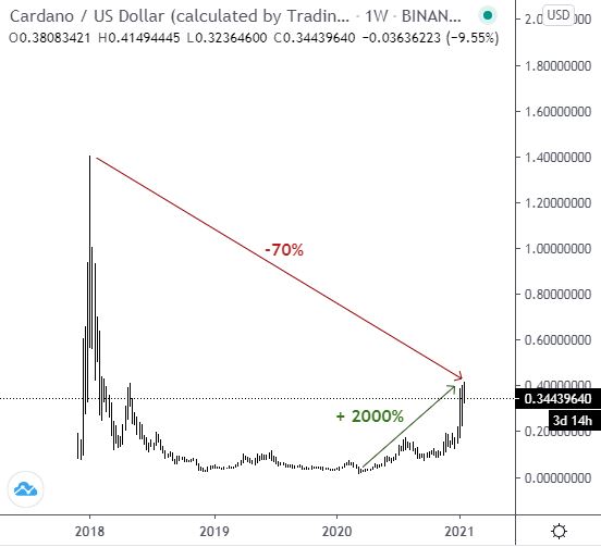 Mindez érdekes kontextusba helyezi több ismert kriptopénz közelmúltbéli menetelését, A Cardano árfolyama például a márciusi tőzsdei összeomlást követően a hússzorosára emelkedett, de még így is 70%-kal olcsóbban lehetett hozzájutni, mint az ATH idején.