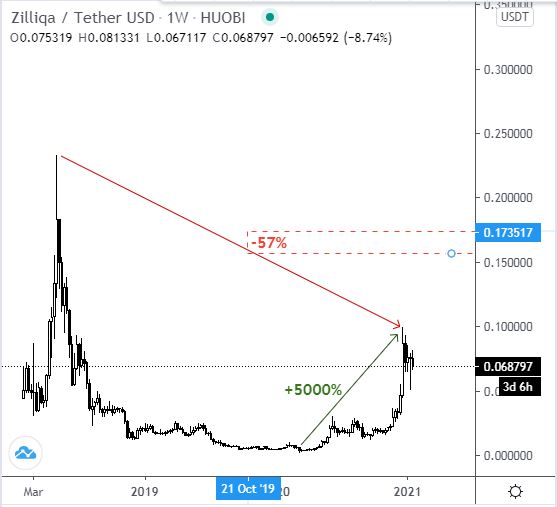 De ugyanezt mondhatnánk el a Zilliqa-ról is, ami az elmúlt 10 hónap során mintegy ötvenszeres növekedésen ment keresztül, ám ez is csak az eddigi elért veszteség alig felének ledolgozására volt elegendő.