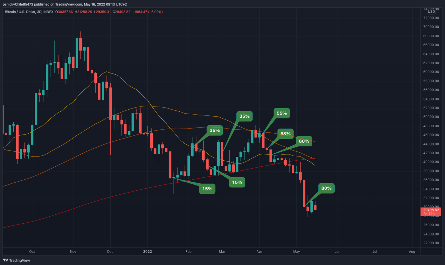 A saját pozíciós kereskedésemben jelenleg 80% a Bitcoin kitettségem, és 20% a szabad készpénz arány. 30000 dolláros szinten megkockáztattam belenyúlni a hulló késekbe, és kicsit leátlagolni a portfóliómat. Ez jó nagy vásárlás volt, mivel addigra a 60% kitettségem kb 50%-re olvadt a BTC értékvesztése miatt. Így az új tétel jelentősen leátlagolta a portfóliót. Swing tételnek szánom ezt a vásárlást, és egy relief rally esetén 34-37000 között vissza tervezem adni a tételt a piacnak.