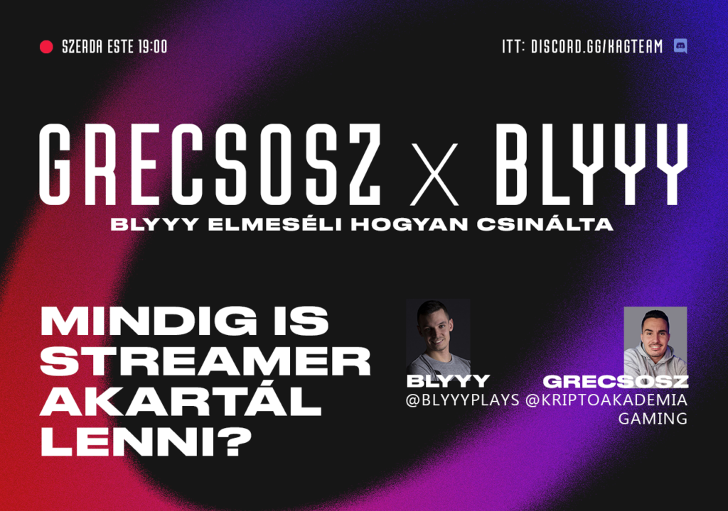 Szerdán este 19:00-kor hazánk egyik legismertebb streamerét bLYYY-t látja vendégül a Kripto Akadémia Gaming csapat Discord szervere.