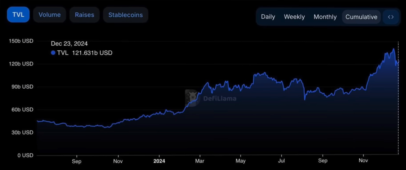 Az összes DeFi protokollon lekötött érték úgy véli, el fogja érni s 400 milliárd dollárt. Ez jelenleg 121.631 milliárdon áll. A DeFi szektor helyzetével mi is kifejezetten sokat foglalkoztunk korábbi cikkeinkben, mivel úgy gondoljuk, hogy 2025-ben ezek is kiemelten jól fognak teljesíteni. (Bár már 2024-ben is masszív erőre kaptak mind a mögöttes protokollok, mind ezek tokenjei.)