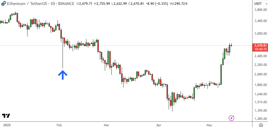 Az ethereum jelenlegi 2600-2700 dolláros szintje éppen megegyezik azzal az árfolyammal, amelyen Eric Trump február 3-án délután ajánlotta követőinek az ETH vásárlását. Az elnök fia akkor azt írta ki közösségi oldalára: „Szerintem a mostani egy remek alkalom arra, hogy $ETH-t vásároljunk. Később megköszönhetitek nekem.” A bejegyzését később szerkesztette, eltávolítva belőle a második mondatot.