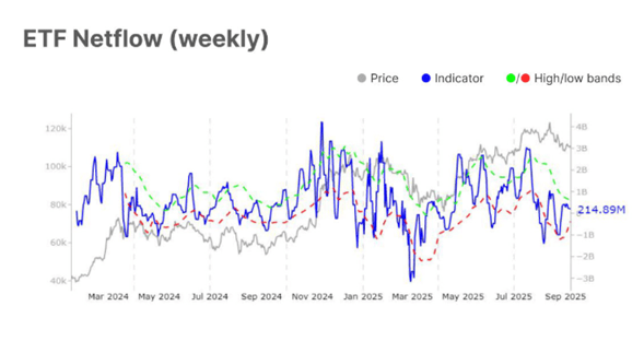 A Bitcoin tőzsdén jegyzett alapok (ETF-ek) szintén a moderáció jeleit mutatták. A nettó beáramlások csökkentek, és a kereskedési volumenek az átlagos statisztikai szintek alatt maradtak. Eközben az ETF MVRV mutatója enyhén emelkedett, ami óvatos profitkivételt jelez.