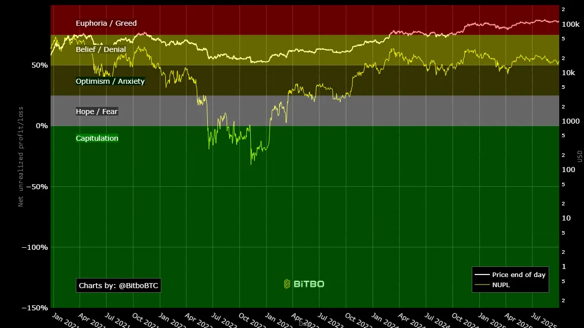 A szeptemberi árzuhanás volt az év legélesebb megingása, de a piac hajlott, de nem tört le. A Net Unrealized Profit/Loss (NUPL) mutató is elkerülte a kapitulációs zónát. A hat számjegyű árfolyamszinteken tapasztalt visszahúzások, még ha szerények is, megnövelik a veszteséges kínálat arányát, de a piac turbulenciaként kezeli őket, nem pedig válságként. A Bitcoin magasabb alapja stresszteszt alatt áll, de a struktúra egyelőre megtartja az árfolyamot.