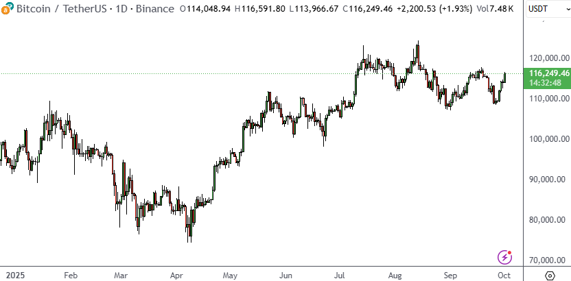 A politikai bizonytalanság és a várható leállás egyelőre nem befolyásolja negatívan a kriptopiacot. A bitcoin az elmúlt napokban 108 650 dollárról 116 000 dollár fölé emelkedett. Bár a klasszikus menekülőeszközök, mint az arany és az ezüst a héten szintén erősödtek, ezúttal a BTC kapott nagyobb lendületet.