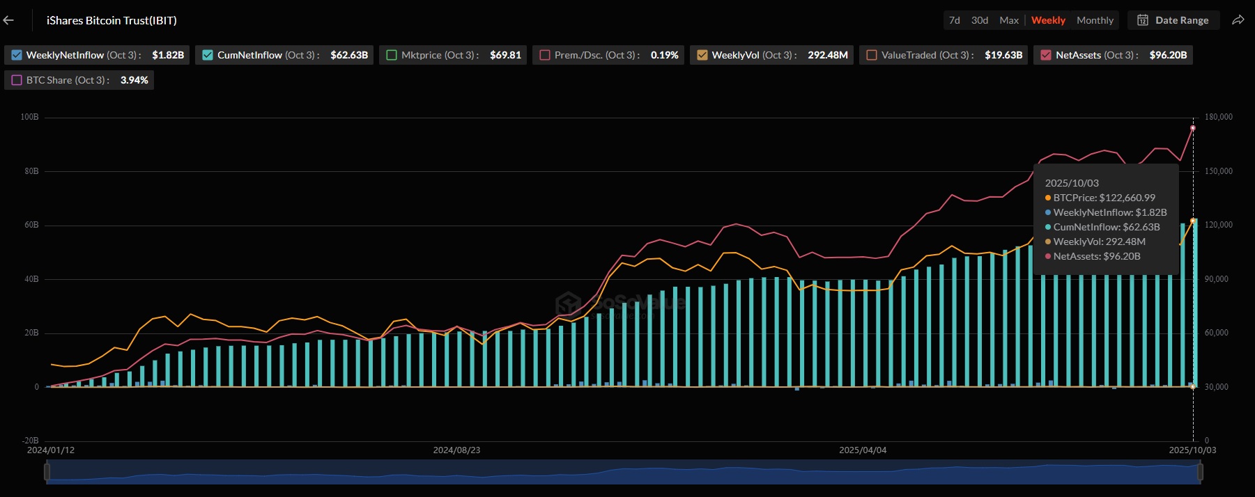 Valószínűleg az új csúcshoz a múlt héten a spot Bitcoin ETF-ekbe beáramló hatalmas 3,24 milliárd dolláros tőke is nagymértékben hozzájárult. Különösen kiemelkedő a BlackRock IBIT terméke, amely szintén új csúcsot ért el a tartott Bitcoin mennyiség tekintetében. Jelenleg 770 000 Bitcoint tartanak letétben, ami 96,2 milliárd dollár értékű, és az elérhető Bitcoin kínálat 3,94%-át birtokolja.