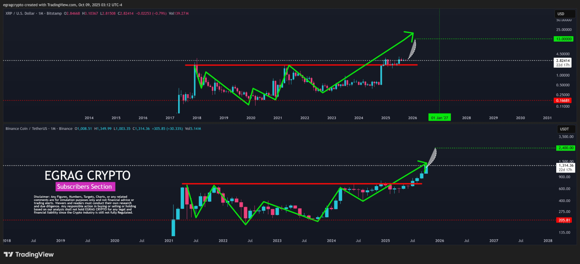 A vezető piaci elemző, EGRAG Crypto ismét a BNB-t és az XRP-t vette górcső alá, és ezek jelenlegi piaci szerkezetét az arany hosszú távú pályájához hasonlította. Elmondása szerint a BNB új történelmi csúcsokra törő, robbanásszerű emelkedése előre jelezheti, mi várható az XRP esetében, ami szerinte 2,8 dollárról akár 13 dollárig is emelkedhet.