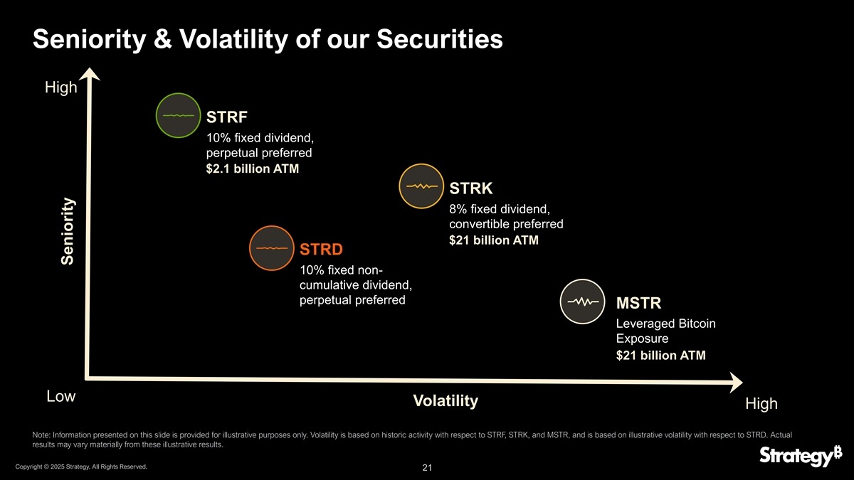 Az elsőbbségi részvények (Perpetual Preferred Stock) hibrid értékpapírok, amelyek a hagyományos részvények és kötvények előnyeit ötvözik. Ezeknek az értékpapíroknak nincsenek lejáratai és fix osztalékot fizetnek mindaddig, amíg a kibocsátó működőképes. A Strategy esetében ezek az értékpapírok arra szolgálnak, hogy stabil, fix jövedelmet biztosítsanak, amelyet a rendkívül ingadozó Bitcoin-vagyon garantál, létrehozva ezzel egy Bitcoin-fedezetű hozamgörbét.