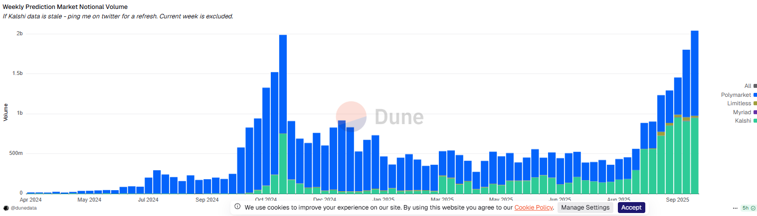 Az integrációk hozzájárultak ahhoz, hogy a predikciós piacterek kereskedési volumene is új heti csúcsra, 2 milliárd dollárra emelkedjen. A Dune Analytics adatai szerint ebből a Polymarket egymilliárd dollárt, míg legfőbb riválisa, a Kalshi 950 millió dollárt tett ki.