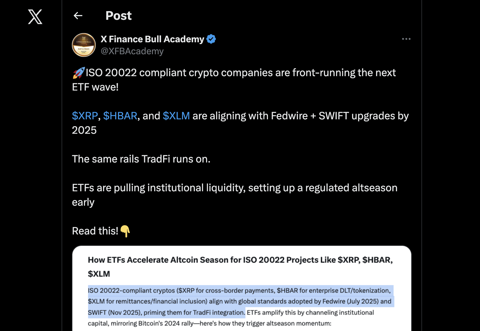 Az X Finance Bull nevű piaci elemző szerint az ISO 20022-kompatibilis kriptovaluták, az XRP, a Hedera és az XLM kiváló pozícióban vannak az intézményi blokklánc-elfogadás következő hullámához.
