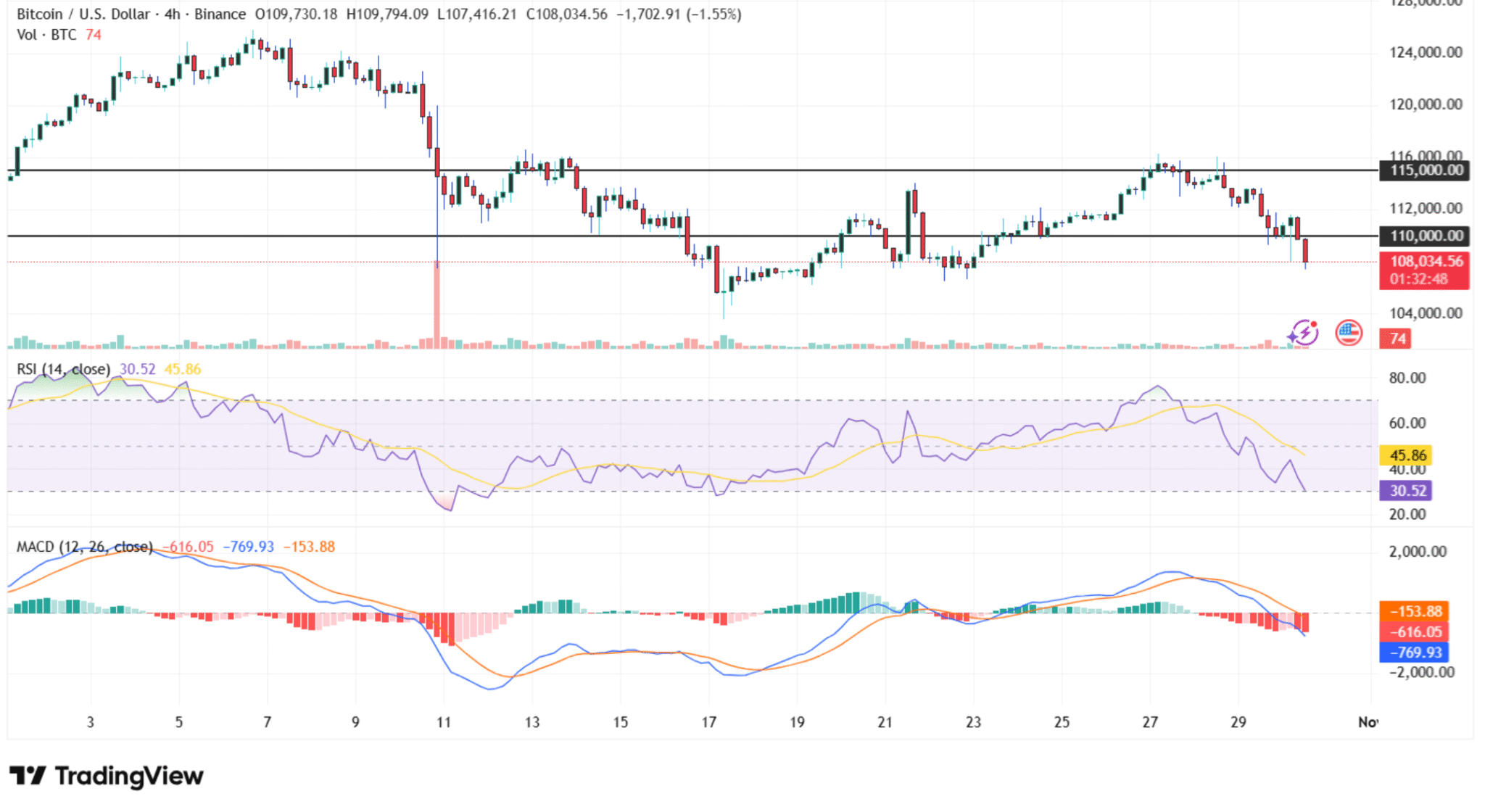 A sokak által figyelt Relative Strength Index (RSI) jelenleg 29,36, a MACD-indikátor pedig szintén lefelé keresztezte a jelzővonalat, ami rövidtávon erőteljes eladói lendületet jelez.