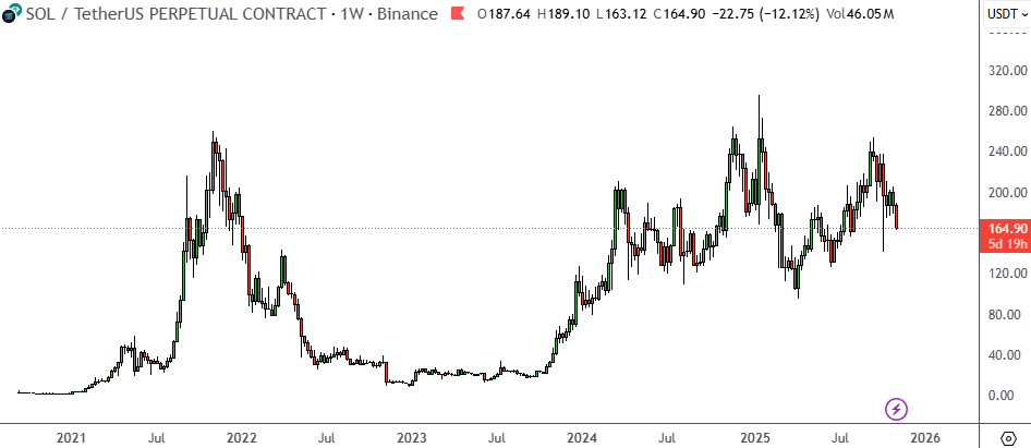 A SOL árfolyama 205 dolláron tetőzött a múlt keddi ETF-rajtot megelőzően, ám ma reggelig 165 dollárra esett vissza, alulteljesítve az elmúlt napokban egyébként is gyengélkedő piac átlagát. Összehasonlításképp: a Bitcoin csaj 6%-ot, az Ether pedig 12%-ot veszített ugyanebben az időszakban.