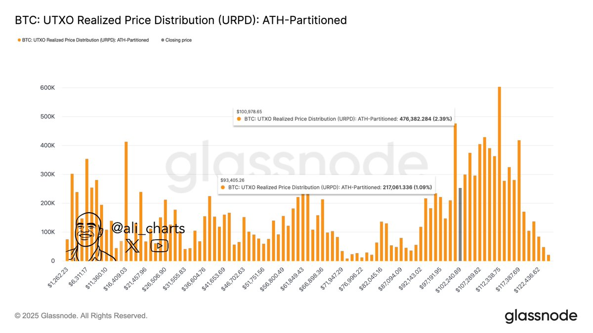 Martinez a 100 980 dolláros szintet emelte ki a Bitcoin egyik kulcsfontosságú támaszaként. A UTXO Realized Price Distribution (URPD): ATH-Partitioned mutató alapján az elemző megállapította, hogy ezen a zónán 476 382,284 BTC (a teljes forgalomban lévő készlet 2,39%-a) cserélt gazdát, így ez a terület így erős támaszt jelent a Bitcoin számára.