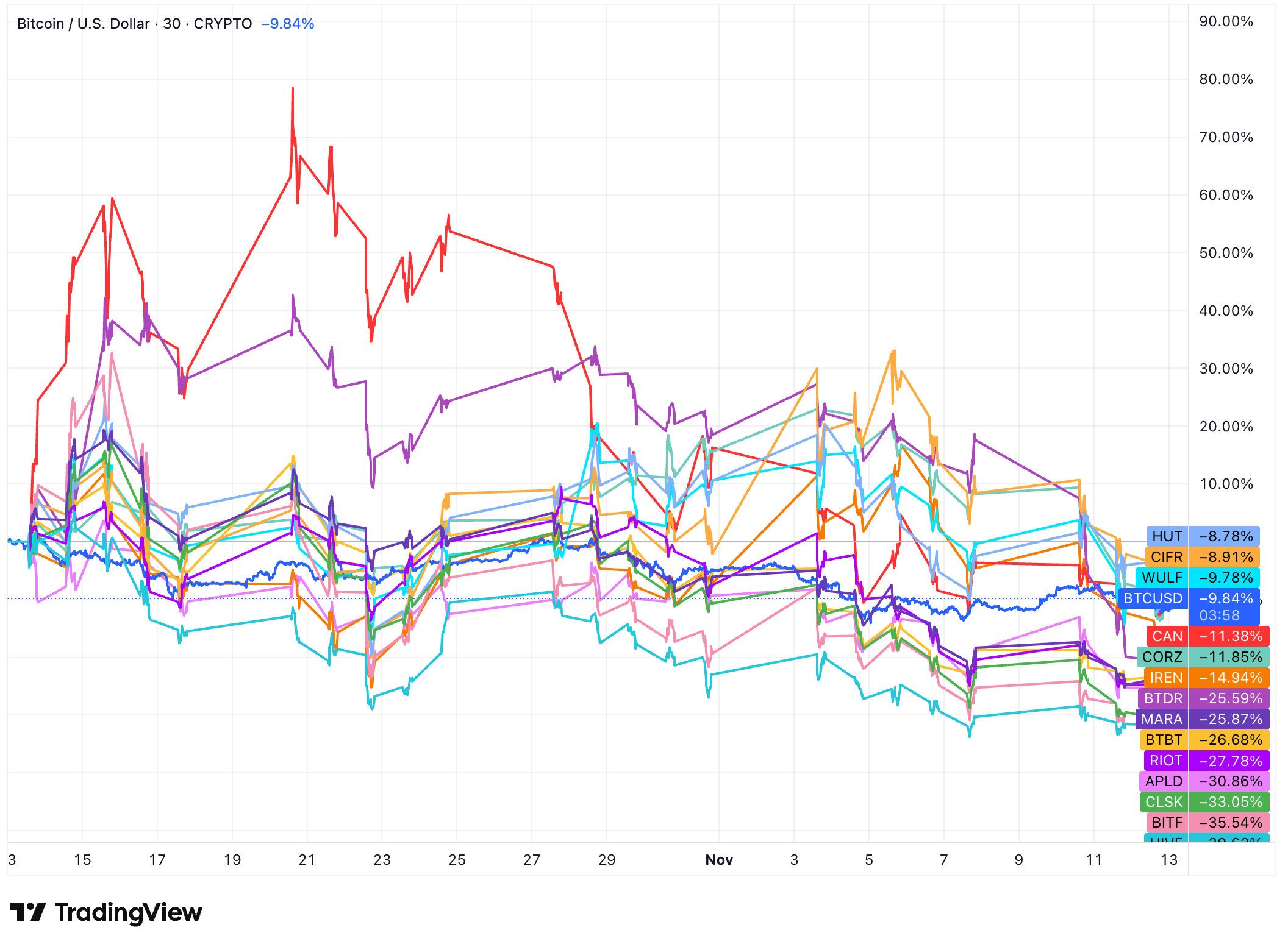 A BTC árfolyama is közel 30%-ot gyengült, a legtöbb bányászrészvény ennél jóval meredekebben zuhant, ezzel tovább erősítve a válság érzetét a befektetők körében. A szektorra jellemző befektetői magatartást is reprezentáló CoinShares Bitcoin Mining ETF (WGMI) is bő 40%-ot esett. A mindenkori csúcsáról, 68 dollárról egészen 39 dollárig húzódott vissza.