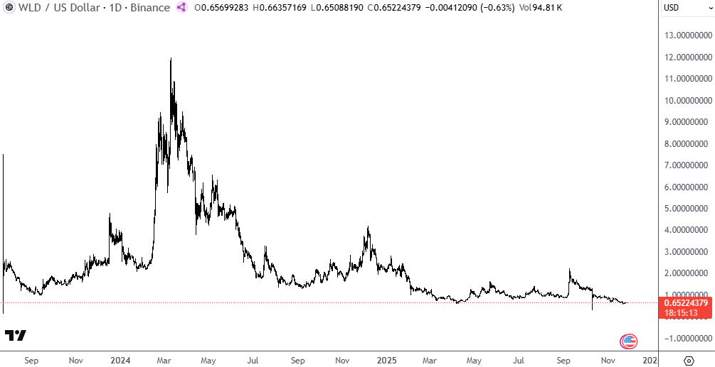 Bár az újabb szabályozói beavatkozás már nem okozott közvetlen esést a Worldcoin token árfolyamában, az továbbra is a valaha elért legalacsonyabb szintjének közelében mozog, és az elmúlt egy év során összességében 80%-ot vesztett az értékéből.