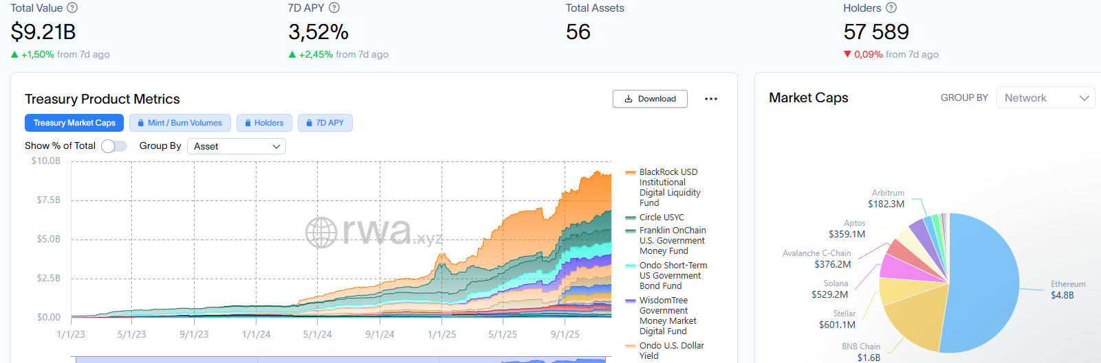 Ezt a szemléletet tükrözi a BlackRock 2024 márciusában indított BUIDL tokenizált pénzpiaci alapja is, ami on-chain kínál hozzáférést tokenizált amerikai dollárhozamokhoz. A több blokkláncon is elérhető alap vagyonkezelése alatt álló tokenizált eszközök összértéke már meghaladja a 2,3 milliárd dollárt, a teljes ágazaté pedig a 9 milliárd dollárt.