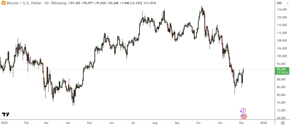A bitcoin az idei évben nagy ingadozásokon ment keresztül, és jelenleg a 2025-ös évet is nyitó 93 000 dolláros szint közelében tartózkodik, miután az októberben elért 125 000 dolláros történelmi csúcsról visszakorrigált.