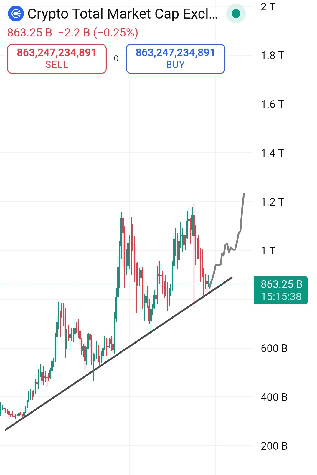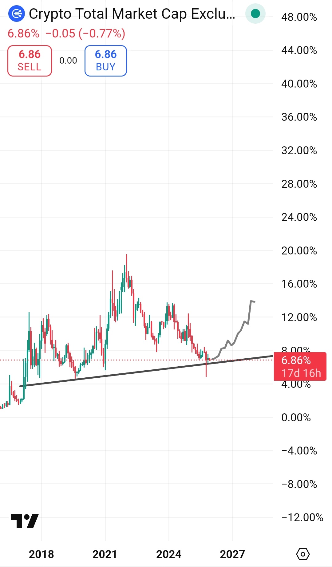 Az altok helyzetét összegző TOTAL3 jelenleg egy olyan hosszú távú emelkedő trendvonalon tartózkodik, amely 2024 eleje óta többször is támaszként működött. Történelmileg ezekről a szintekről indultak el azok az időszakok, amikor az altcoinok szélesebb köre is jelentős emelkedést produkált.