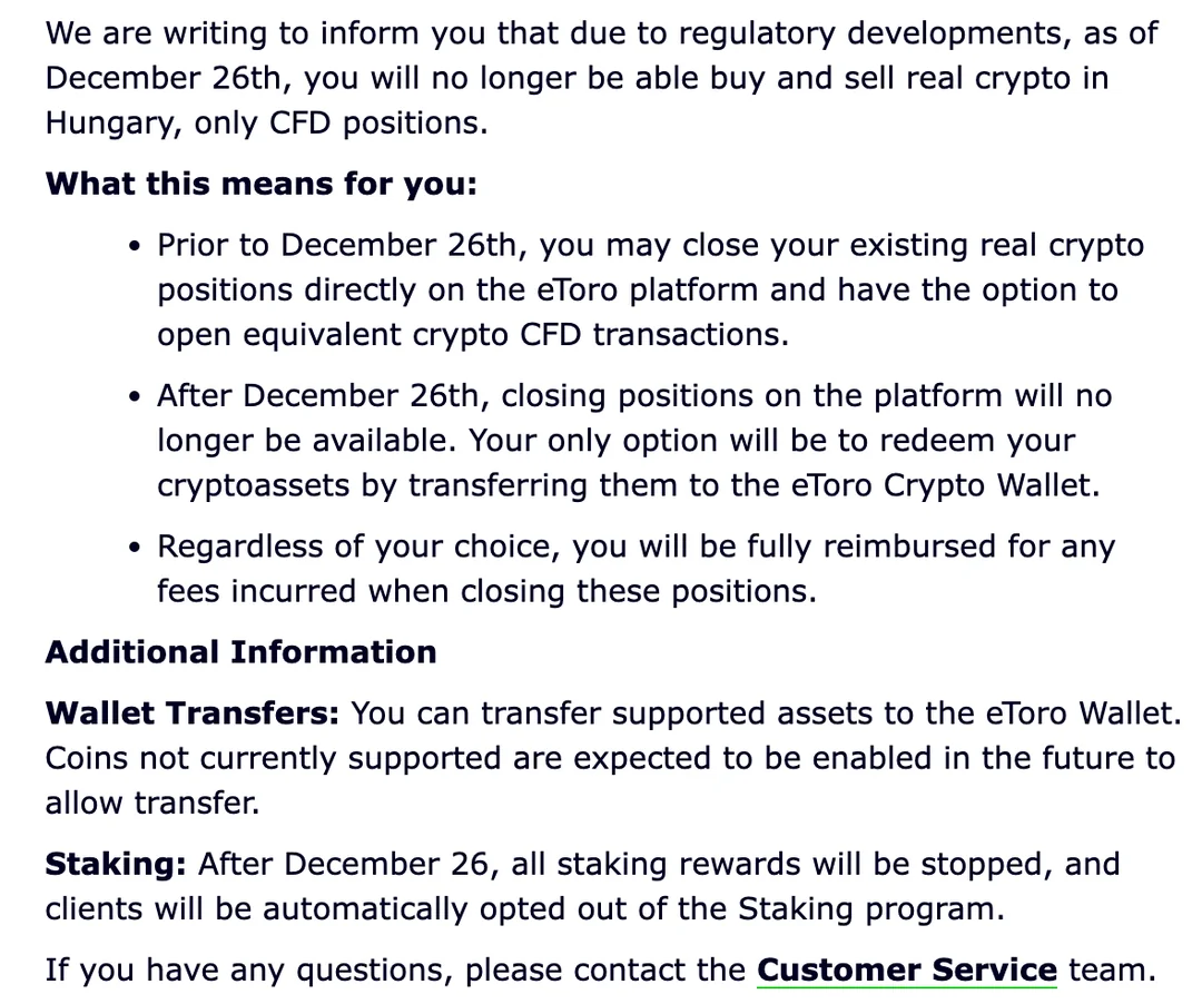 Fontos hangsúlyozni, hogy az eToro nem tűnik el teljesen hazánkból, de a szolgáltatása alapjaiban változik meg. A jövőben kizárólag kripto CFD eszközök kereskedése lesz elérhető a magyarok számára. Ez a gyakorlatban azt jelenti: