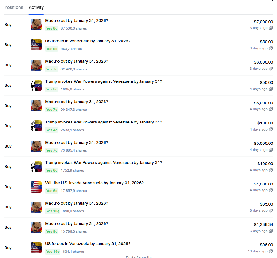 Az első fogadása december 31-én jelent meg a platformon. A felhasználó egy 96 dolláros téttel indított, majd további összegekkel, egészen január 3-án hajnalig növelte tovább a pozícióit, az amerikai katonai művelet kezdetéig.