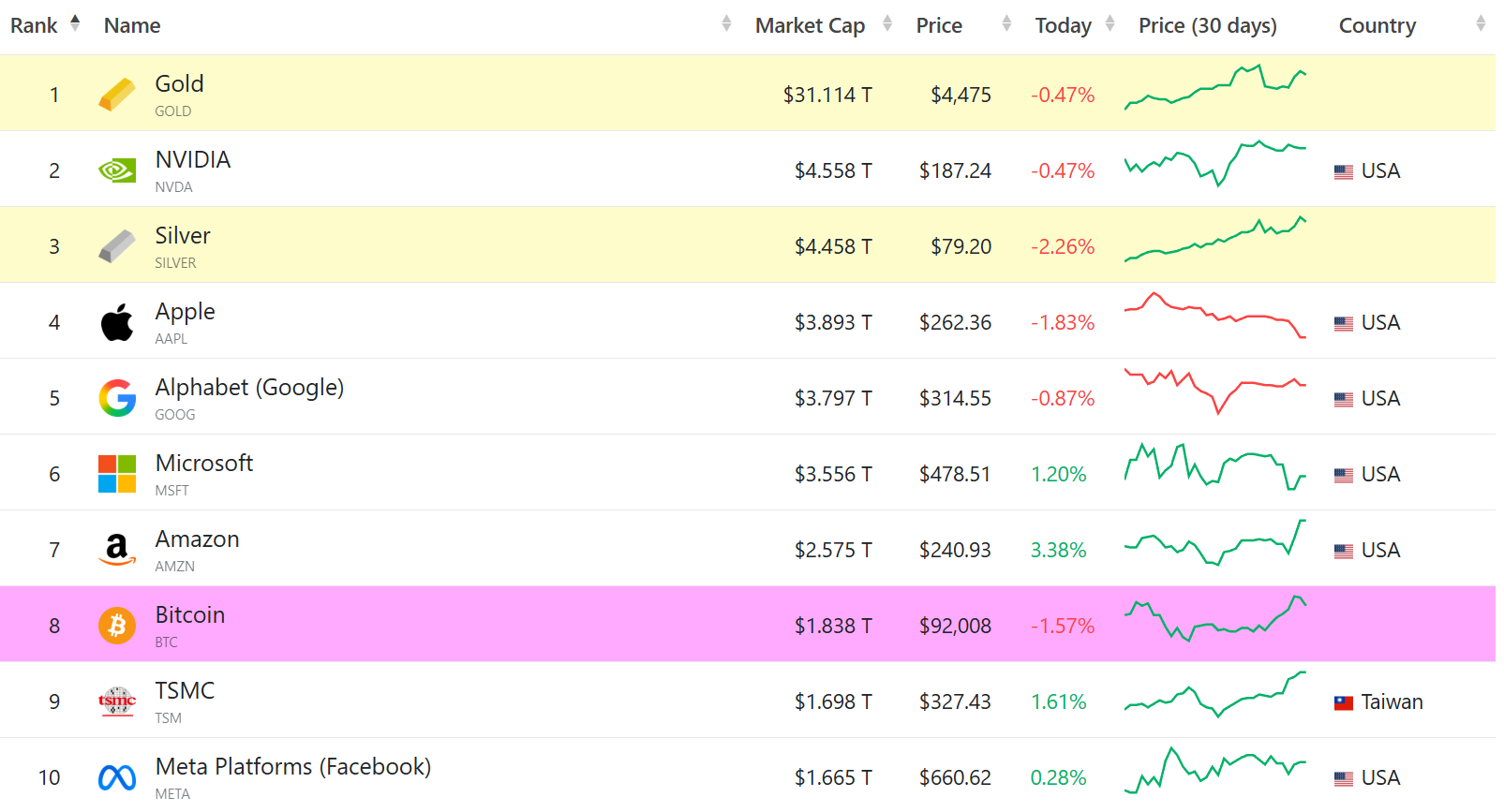 Az ezüst piaci értéke az elmúlt napokban többször is megelőzte a chipgyártó óriás Nvidia-t, szoros versenyt kialakítva világ legértékesebb eszközei közötti harcban. A rangsor élén továbbra is toronymagasan vezet az arany, miközben a bitcoin látszólag képtelen lendületbe jönni.