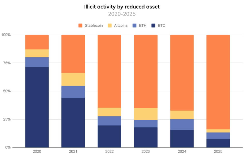 A Bitcoin egy időben szinte egyet jelentett az online bűnözéssel, dominanciája azonban folyamatosan csökken. Ennek oka, hogy a stabilcoinok gyorsabbak, az értékük kiszámíthatóbb, és egyre jobban kapcsolódnak a modern pénzügyi infrastruktúrához.