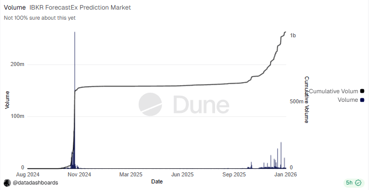 Az IBKR még 2024 végén tette elérhetővé felhasználóinak a predikciós piacokat. Az akkori napok kiugró forgalma után hosszú szünet következett, ám tavaly ősztől ismét elkezdett fokozódni az aktivitás.