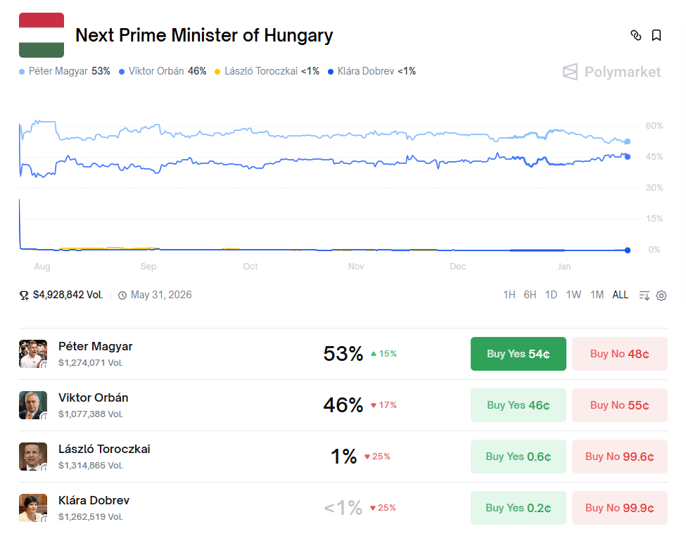 A magyar felhasználók aktivitása akkor ugrott meg igazán az oldalon, amikor a 2026-os országgyűlési választás is bekerült a fogadási lehetőségek közé. A Polymarketen arra lehetett előrejelzést adni, hogy Orbán Viktor vagy Magyar Péter lesz Magyarország következő miniszterelnöke. Az érintett piac az elmúlt hónapokban mintegy 5 millió dolláros, vagyis több mint másfél milliárd forintos forgalmat bonyolított.