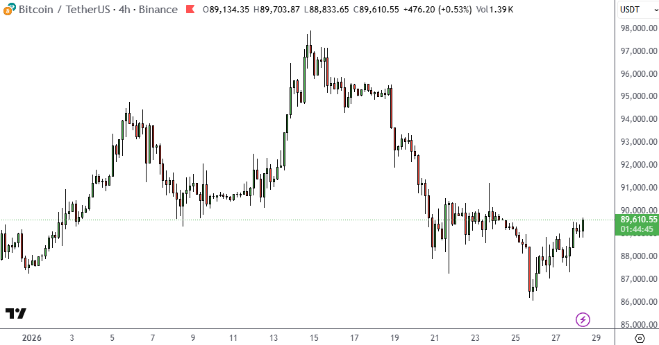 A bitcoin a cikk írásakor 89 610 dolláron állt, 1962 dollárral magasabban az évet indító 87 648 dolláros árfolyamnál.