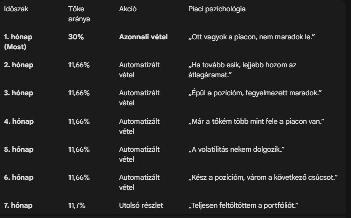 A lényege, hogy kivesszük az egyenletből az érzelmeket és az időzítéssel járó stresszt. Ahelyett, hogy megpróbálnánk eltalálni a “legalját”, kisebb összegeket fektetünk be rendszeresen.