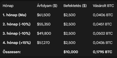 Ha havi 2 500 dollárért vásárolsz, és az árfolyam a következő hónapokban tovább csökken, majd csak később pattan vissza, a 4. hónap végére akár 10%-kal több Bitcoint tudsz szerezni ugyanazért a pénzért, miközben az átlagárad sokkal közelebb kerül a valódi mélyponthoz.