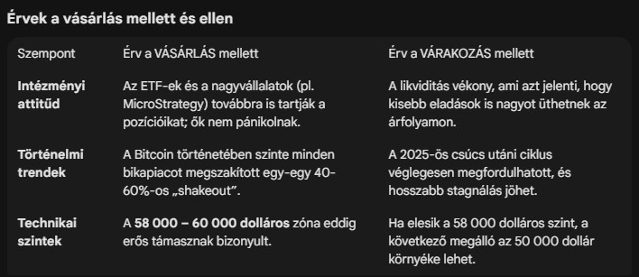 - A várakozás mellett: A piaci likviditás jelenleg vékony, és ha elesik az 58 000 dolláros támasz, a következő megálló akár az 50 000 dolláros szint is lehet.