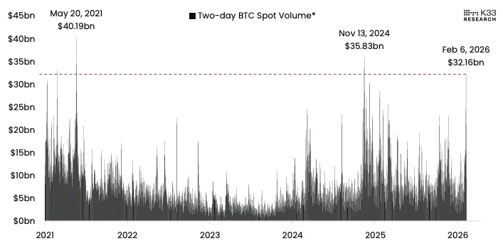 Kétségbeesett eladások: Február 6-án a forgalom elérte a 32 milliárd dollárt, ami az elmúlt öt évben csak a hírhedt FTX-tőzsde összeomlásakor volt tapasztalható.