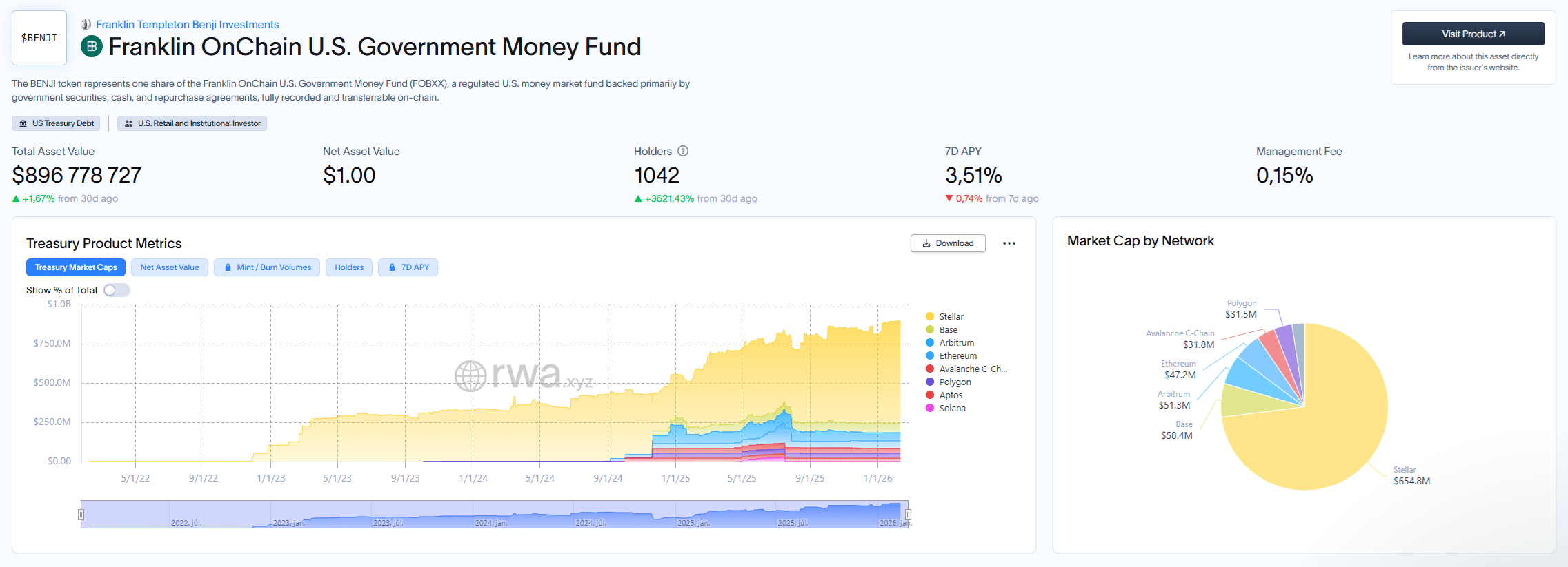 A Binance-Templeton rendszer motorja, a Franklin OnChain U.S. Government Money Fund (FOBXX), jelenleg a világ negyedik legnagyobb tokenizált kincstári alapja. Az RWA.xyz adatai szerint az alap már most 896 millió dolláros vagyonnal rendelkezik.