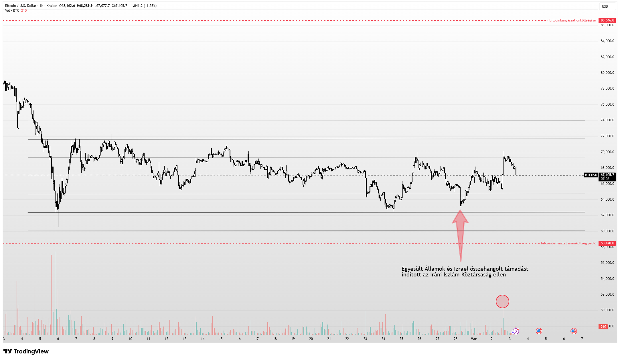 A kezdeti sokkot azonban gyors fordulat követte. A spekulánsok arra fogadtak, hogy a rezsim lefejezése lerövidítheti a konfliktust, ami rövid időre 68 000 dollár fölé lökte az árfolyamot. Bár az iráni válaszcsapások hírére – amelyek Izraeltől az Öböl-menti amerikai bázisokig több célpontot is érintettek – a rali átmenetileg kifulladt, a piac hamar magára talált.