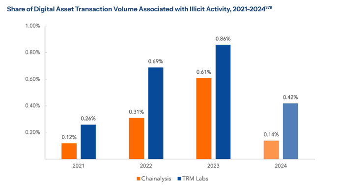 A jelentés szerint az illegális felhasználáshoz köthető kriptoforgalom az elmúlt években több blokkláncelemző cég szerint is 1 százalék alatt maradt. A hagyományos pénzrendszerben ugyanez az arány 2-5 százalékra tehető.