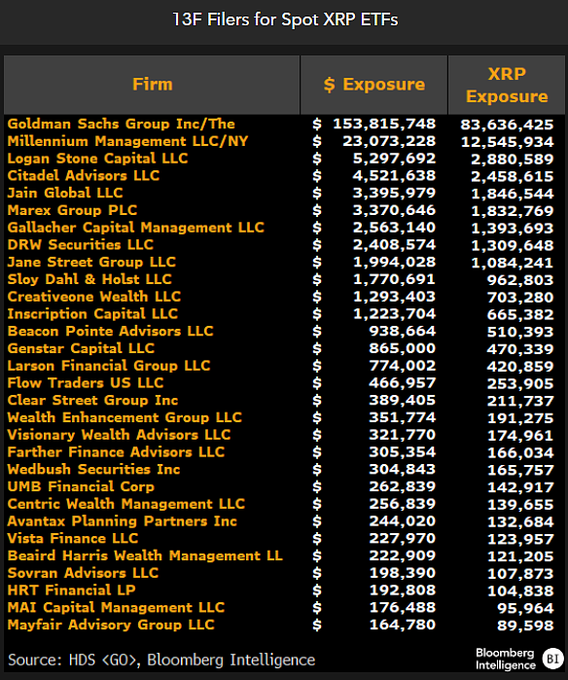 Seyffart adatai szerint a spot XRP ETF-ek 30 legnagyobb tulajdonosa összesen mintegy 211 millió dollárnyi ETF-részesedést birtokol. Ezen a listán messze a legnagyobb befektető a Goldman Sachs volt, ami közel 154 millió dollár értékben tart XRP ETF-részvényeket.
