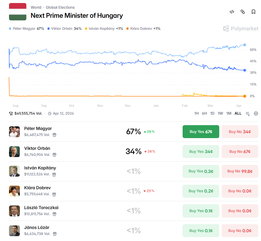 Magyarország januárban ideiglenes tiltást jelentett be a két legnagyobb predikciós piactérre, a Polymarketre és a Kalshira, melyek a vasárnapi választások kimenetelére is lehetővé teszik a fogadásokat. A legnagyobb ilyen forgalmú piactéren közel 50 millió dolláros (kb. 16,5 milliárd forintos) forgalom mellett a Tisza Párt jelöltjét, Magyar Pétert látják esélyesebbnek a felhasználók.