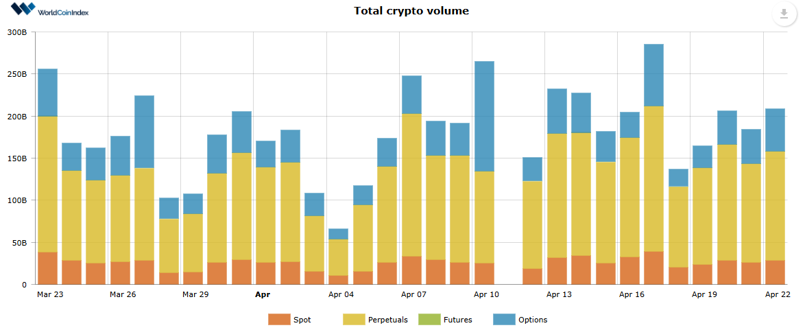 A perpetual futures (sárgával) a kriptovilág legnépszerűbb kereskedési formája és azért vonzó a szolgáltatóknak, mert hatalmas forgalmat és ezáltal jutalékot generál. Az ágazat napi kereskedési forgalmának több mint 60 százaléka ilyen piactereken zajlik.