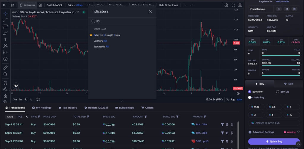 Ha sikerült találni egy szimpatikus tokent, akkor elemzéséhez segíthetnek az Indikátorok bal felül. Mi az RSI-t ajánljuk. Jobb oldalt alul pedig látni fogod a Quick buy (azonnali vételt), vagy Buy dip (ha esett x %-ot.) lehetőségeket, itt tudod megvásárolni a tokent.