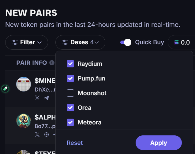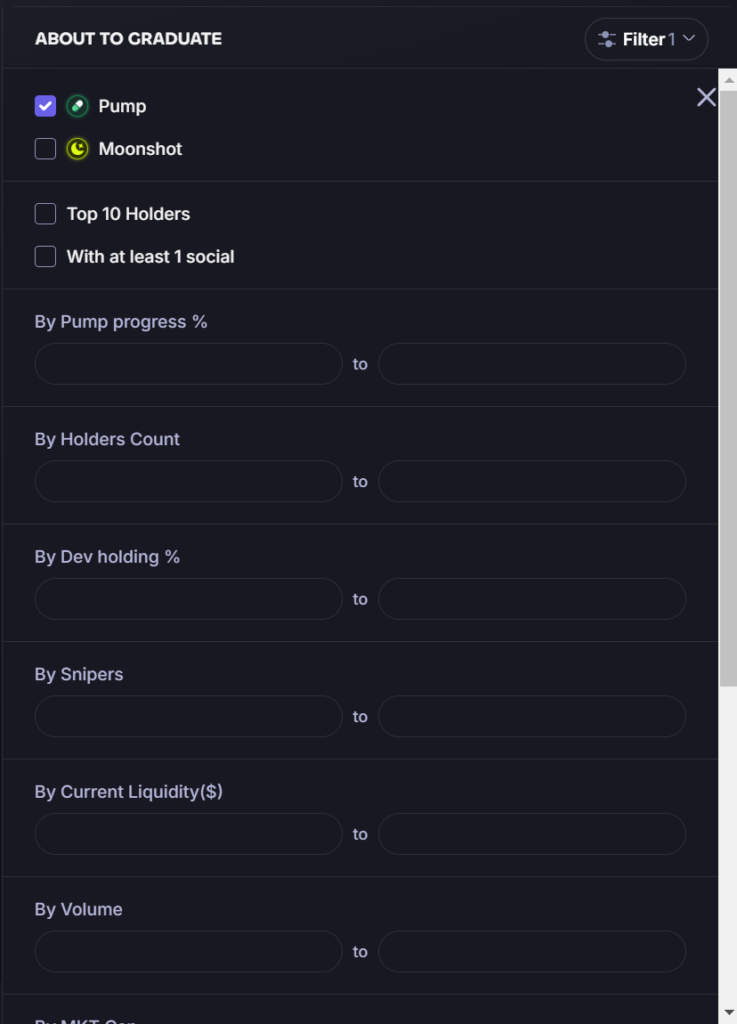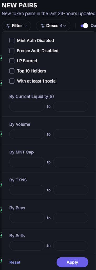Itt is lehet külön filtereket beállítani, ahol tudsz ezer féle lehetőségből választani mint például: hány tranzakció volt, jelenlegi likviditás, volumen, pump progress (bonding curve-hez milyen közel áll) stb.
