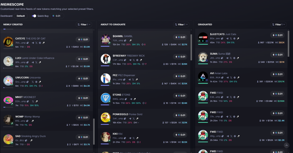 Memescope-nál látod az összes Pump Fun-on készített memecoinokat. Három csoportra osztva: