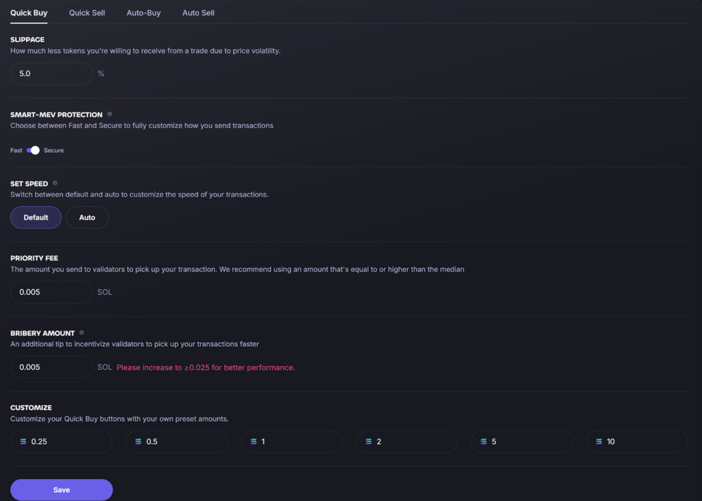 A jelenleg kiválasztott lánc alatt található a Settings gomb. Itt tudjuk beállítani a Slippaget, MEV védelmet és prioritás díjakat.