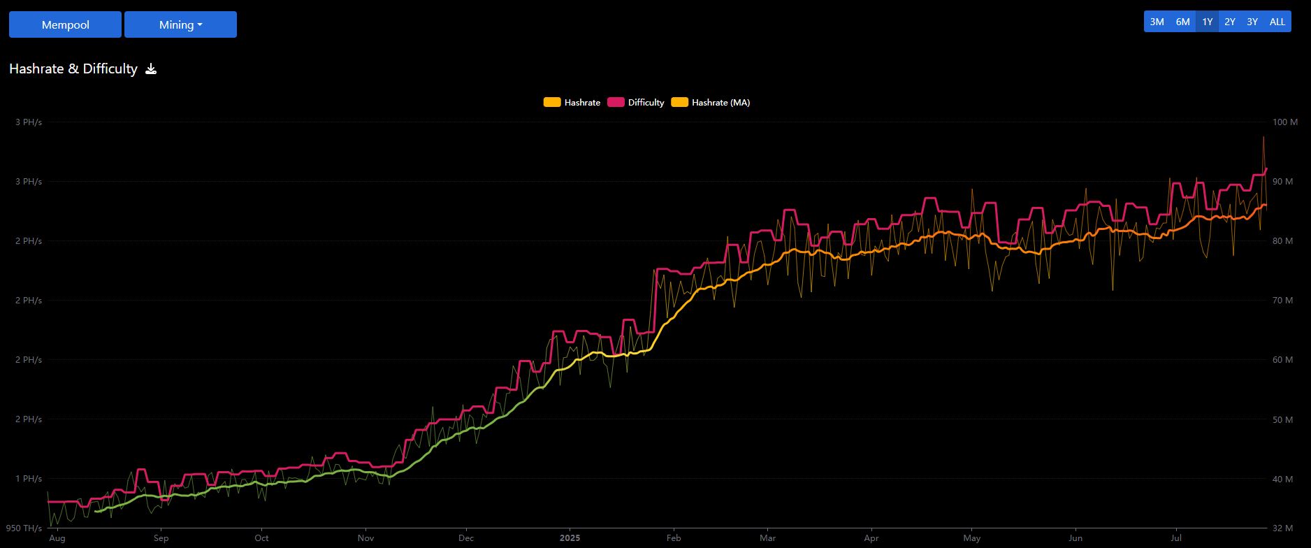 2025 márciusára a Litecoin biztonsági mutatói minden korábbinál magasabb szintre emelkedtek, ahogy az év során drámaian nőtt a hálózat hashrátája. Míg 2025 elején még nagyjából 1 petahash/másodpercen állt ez az érték, júliusra már 2,4 petahash/másodpercre ugrott, ami hatalmas növekedést jelent számítási kapacitás terén. A folyamatos bővülés a bányászok egyre növekvő bizalmát tükrözi. Egyben azt is jelenti, hogy a Litecoin hálózata immár vállalati szintű infrastruktúrává fejlődött.