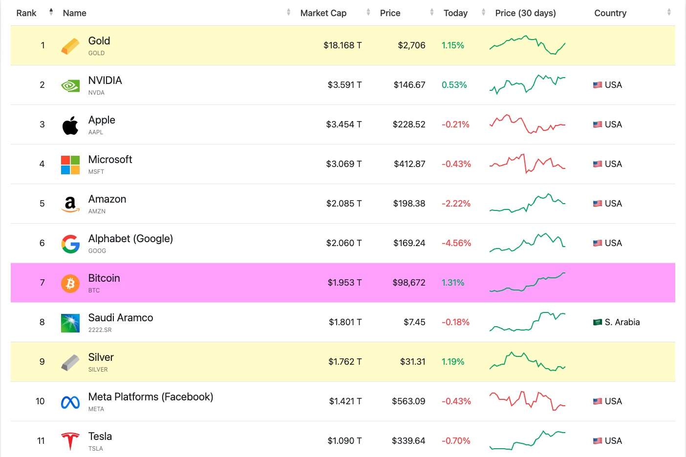 A Bitcoin piaci kapitalizációja is elképesztő 1,956T dollárra nőtt, amivel a 7. legnagyobb eszközzé vált globálisan. Ezzel a lépéssel a Bitcoin két szimbolikusan jelentős globális eszköz fölé került: az ezüst és a Saudi Aramco fölé, kicsivel elmaradva a Google Alphabet-jétől és az Amazontól.
