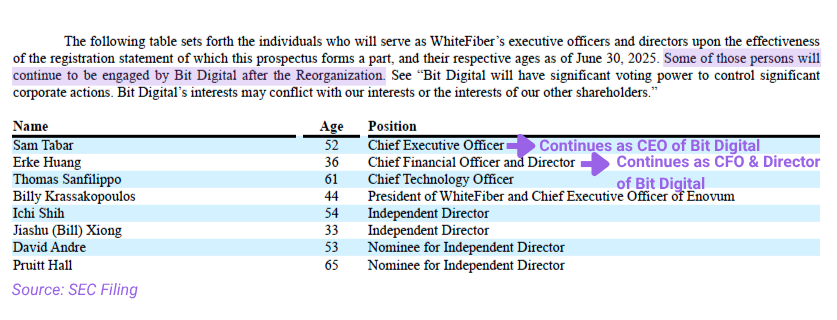A vezetőség tekintetében a WhiteFiber újonnan összeállt csapattal dolgozik, ám a Bit Digital néhány kulcsfontosságú vezetője továbbra is betölt különböző pozíciókat. Emellett független igazgatókat is kineveztek, akik az adott területen szakértők. Összességében ez a struktúra biztosítja a folytonosságot és a stratégiai összhangot, különösen egy gyors növekedési szakaszban, ugyanakkor kérdéseket vet fel a későbbi irányítási függetlenség kapcsán.
