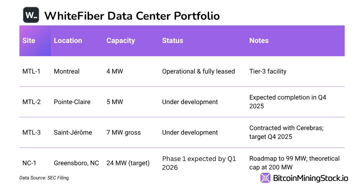 A WhiteFiber előrejelzése szerint 2026 végére a 76 MW-os bruttó kapacitást kívánja elérni. A vállalat emellett egy ennél jóval nagyobb, körülbelül 1 300 MW-os fejlesztési portfólióról számolt be, amely jelenleg vezetői felülvizsgálat alatt áll.