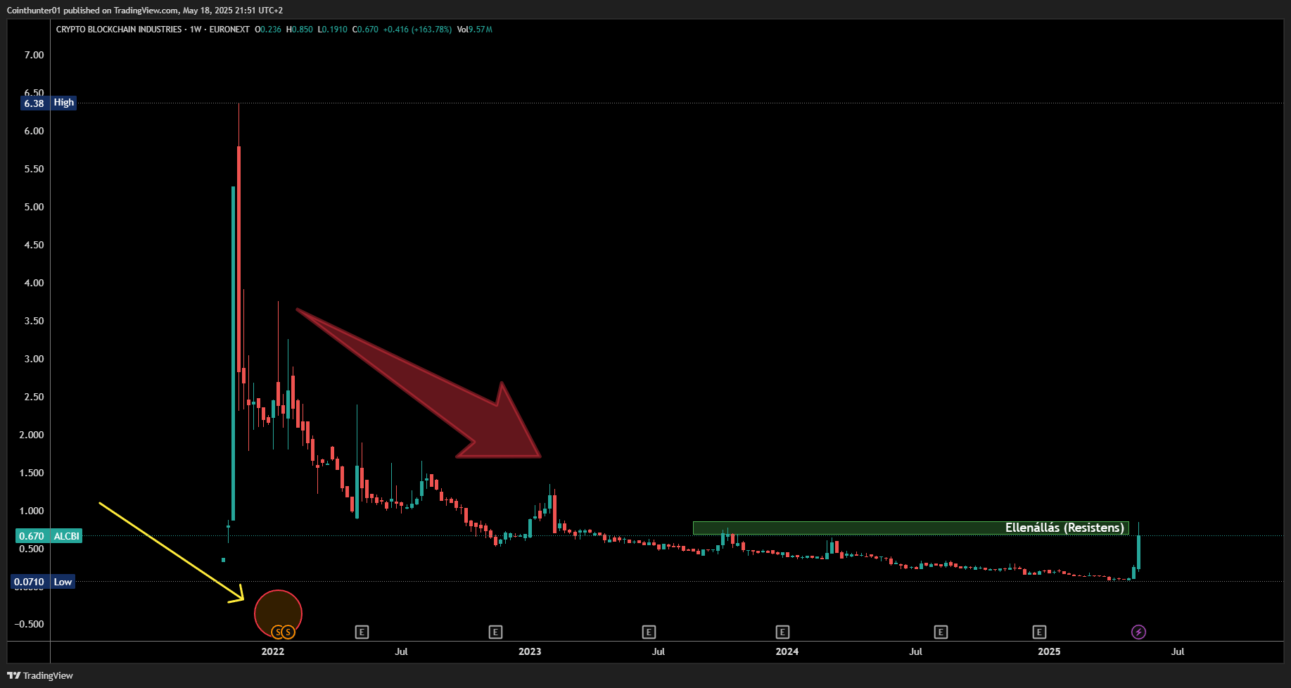 Ezt követően, évek alatt a papír értéke lassan csökkenni kezdett, és idén április 14-e körül elérte a mélypontot, ami 0,0710 euró volt. Az ár az elmúlt 2 hétben rendkívül impulzív emelkedésbe kezdett, ami nagyon biztató, hiszen a 2023-as októberi szintig tudott erősödni. Ez a szint egy erős ellenállás is egyben, ami megálljt parancsolt az emelkedésnek. Természetesen ilyen impulzív emelkedés esetén (163% az előző héten) minden indikátor túlvettséget mutat, igy ezekre jelenleg biztos pontként nem támaszkodhatunk.